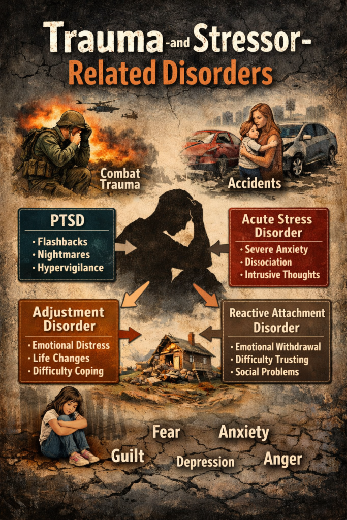 Trauma has a profound impact on the human mind, and abnormal psychology devotes significant attention to understanding how extreme stress alters emotional and psychological functioning. Post-Traumatic Stress Disorder (PTSD) is perhaps the most well-known trauma-related disorder. It can develop after exposure to life-threatening events such as war, natural disasters, accidents, or assault.