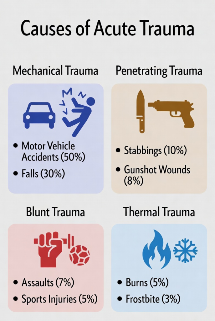 Acute trauma can arise from a variety of sources, broadly categorized into physical, emotional, and environmental causes.