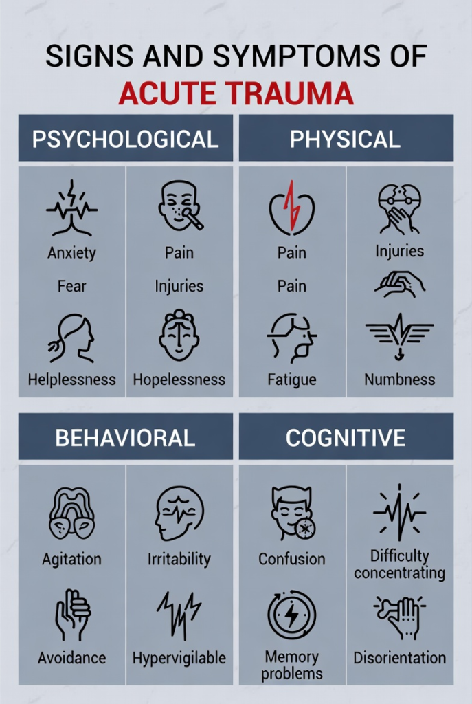 Recognizing acute trauma is the first step toward effective management. Symptoms often present in both physical and psychological forms, and sometimes they overlap.