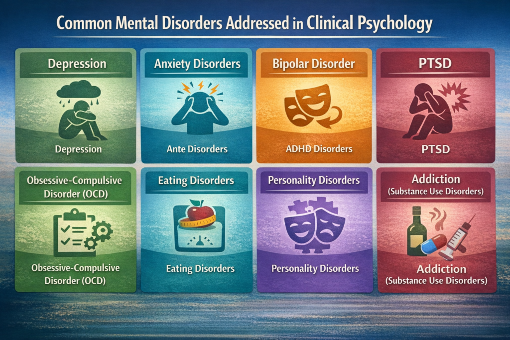Clinical psychologists treat a wide range of mental health conditions. Anxiety disorders involve excessive fear or worry, while mood disorders include depression and bipolar disorder. Personality disorders affect patterns of thinking and behavior, often impacting relationships. Psychotic disorders involve distorted perceptions of reality, and trauma-related disorders result from distressing experiences.
