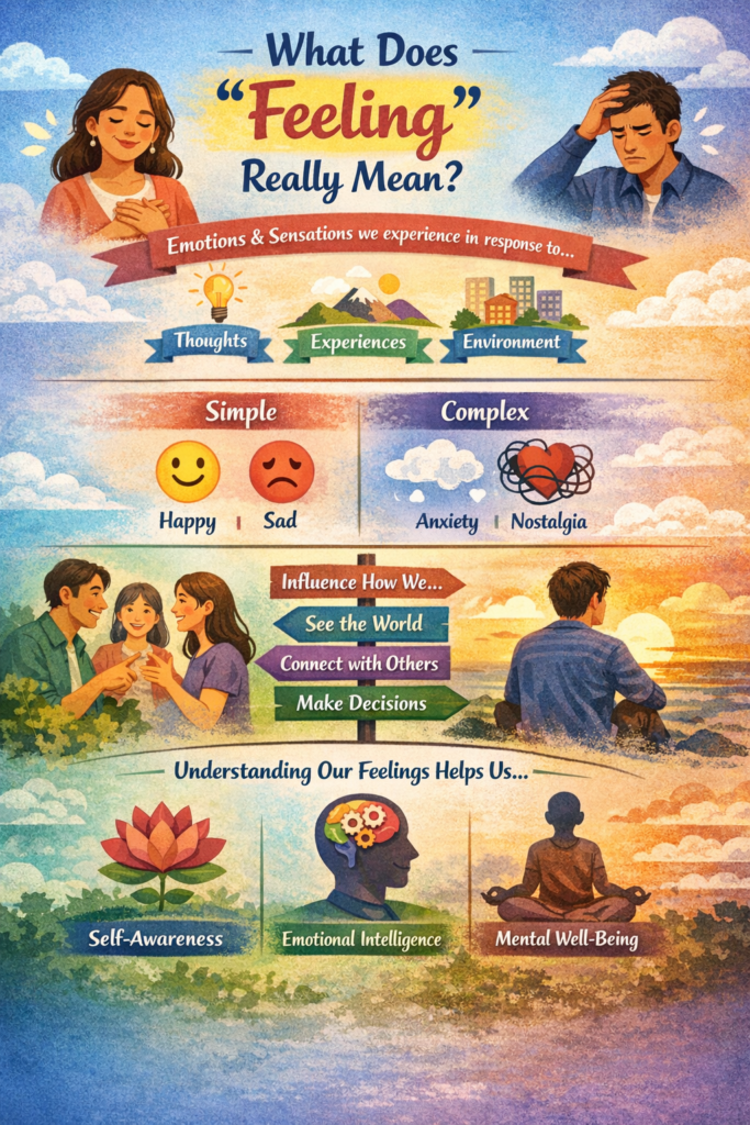 Feeling, in psychological terms, refers to the subjective experience of emotions and physical sensations. It’s how your mind interprets what’s happening inside your body and around you. In everyday life, though, feeling is much more fluid. We use the word to describe emotions (“I feel happy”), bodily sensations (“I feel cold”), intuitions (“I feel this is right”), and even vague inner states we can’t fully explain.
