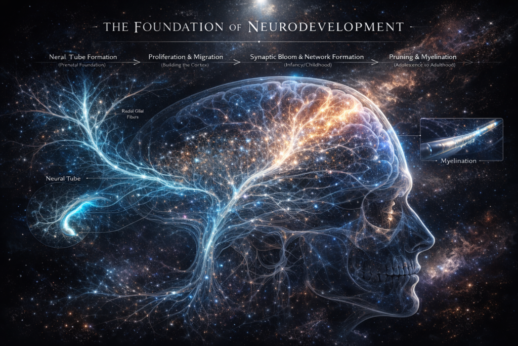 To truly understand neurodevelopmental disorders, it helps to first understand how the brain develops. From the moment of conception, the brain begins an incredibly complex journey. Billions of neurons form, migrate, and connect, creating networks responsible for movement, language, emotions, and thinking. This process doesn’t happen overnight. It unfolds in carefully timed stages, from pregnancy through early adulthood.