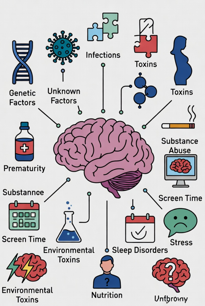 Neurodevelopmental disorders arise from a complex interaction of genetic and environmental factors. There is rarely a single cause. Instead, multiple influences shape brain development before, during, and after birth.