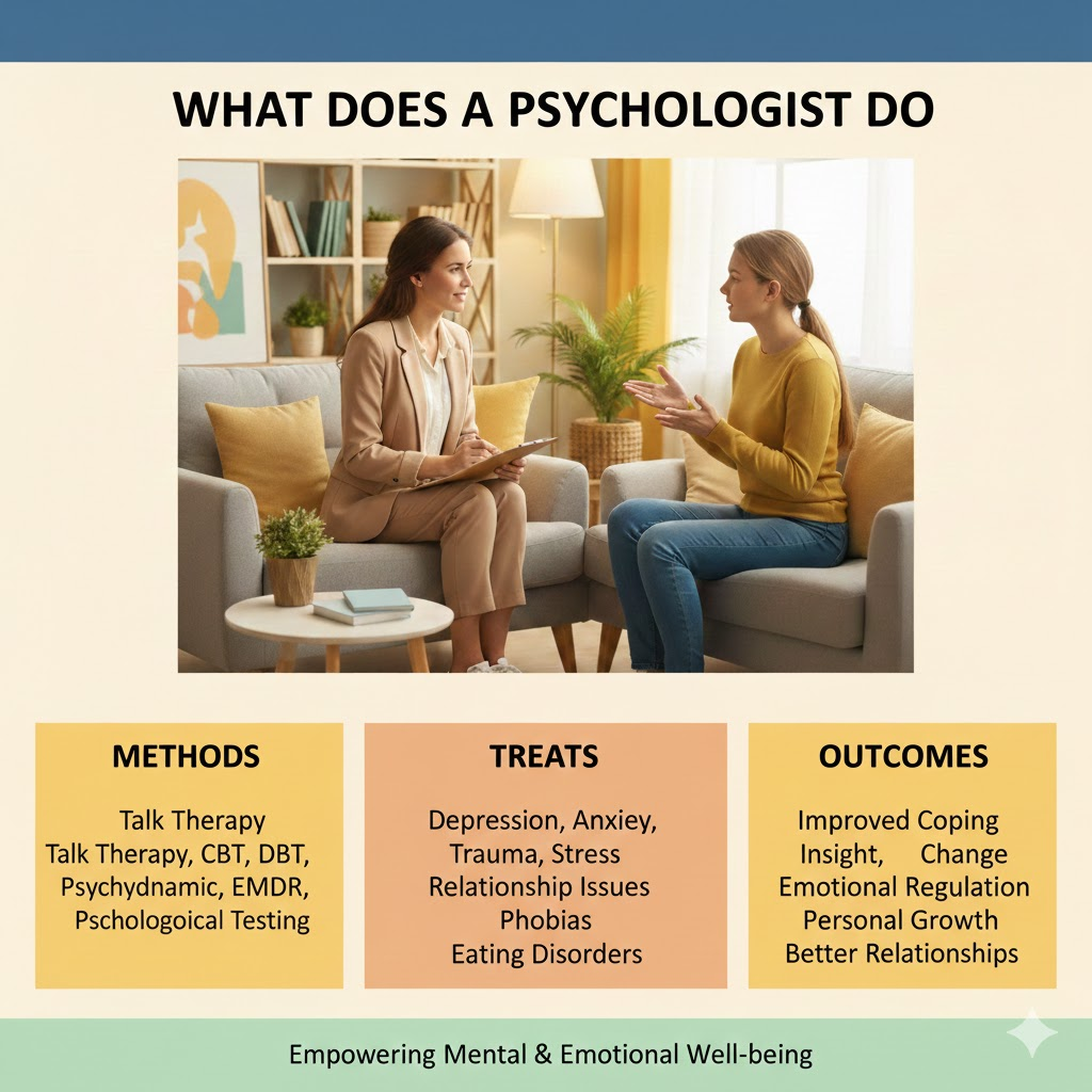 Beyond therapy, psychologists often engage in research, teaching, and consultation. They contribute to scientific understanding of mental health and help shape public policy, education systems, and workplace practices. In short, psychologists focus on the mind, behavior, and emotional resilience rather than medication or medical treatment.